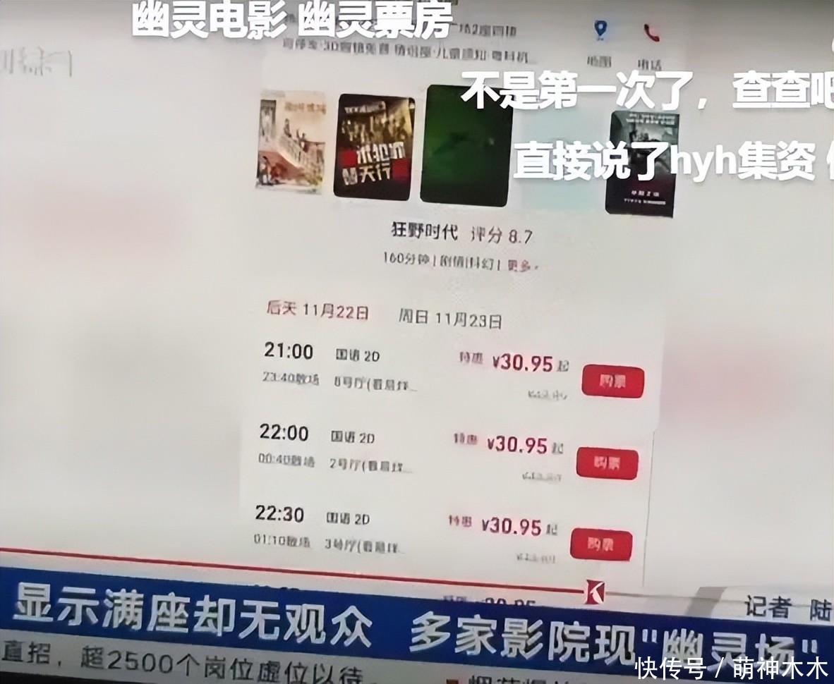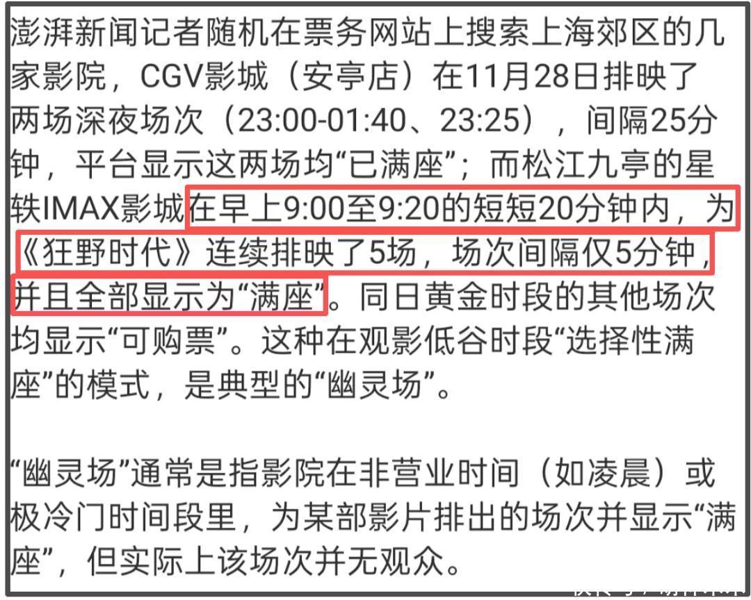 此前,曾有上海电视台的记者去电影院实地探访了《狂野时代》的深夜场,发现多家影院出现了“幽灵场”,电影院放映厅不播电影,座位上空无一人,有的场次甚至连灯都没开。对此,影院给出的解释是粉丝包场,不按照正常票价计算。