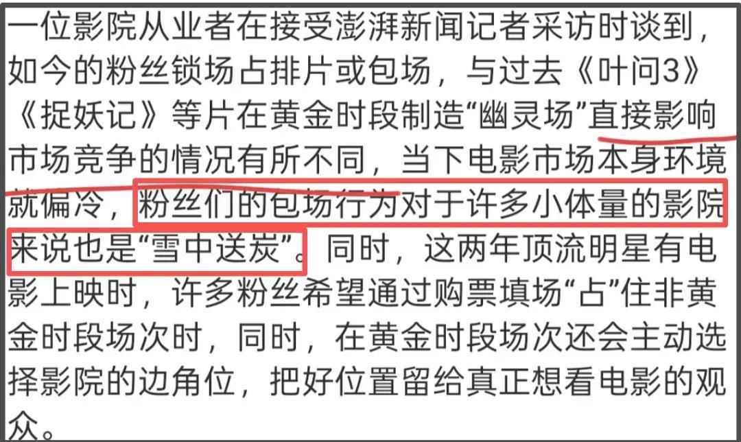 但是面对这样典型的“幽灵场”,报道字里行间毫无谴责意味,反而隐隐有一种为其洗白的意图,将如今的“幽灵场”和《叶》、《捉妖记》时期的“幽灵场”区分开,并表示如今粉丝们的这种异常的包场行为是“雪中送炭”。