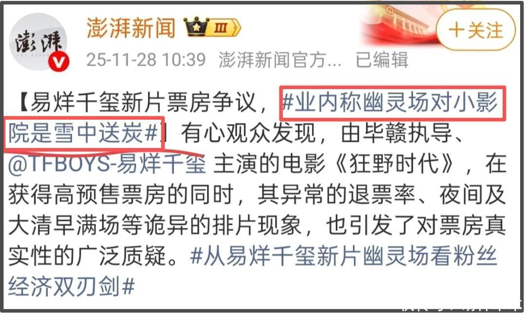 易烊千玺主演的《狂野时代》自上映之后就争议满满,从口碑扑街到退票率飙升再到陷入“幽灵场”风波,一部电影戏里故事不怎么样,戏外的故事却是精彩纷呈。如今,《狂野时代》连续多日票房倒挂,深夜注水被扒,却还有业内人士为“幽灵场”洗白,真的是讽刺感拉满啊。