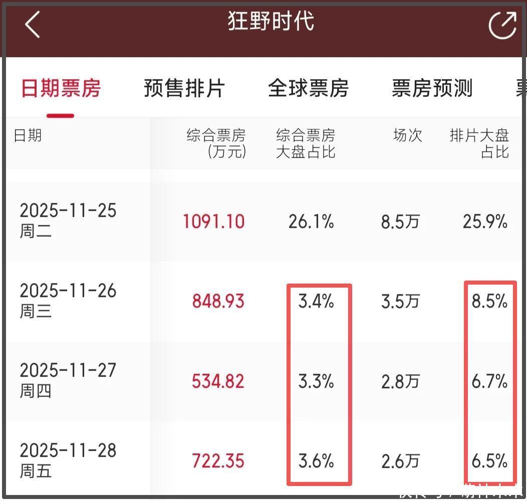 从平台曝光的数据中可以看到,《狂野时代》连续多日综合票房大盘占比远远低于排片大盘占比。在排片大盘占比分别𰹌.5%、6.7%.5%的情况下,综合票房大盘占比已经连续三天没有超%,实现了连续多日的票房倒挂。哪怕排片已经日益减少,依旧阻挡不了票房倒挂的节奏。